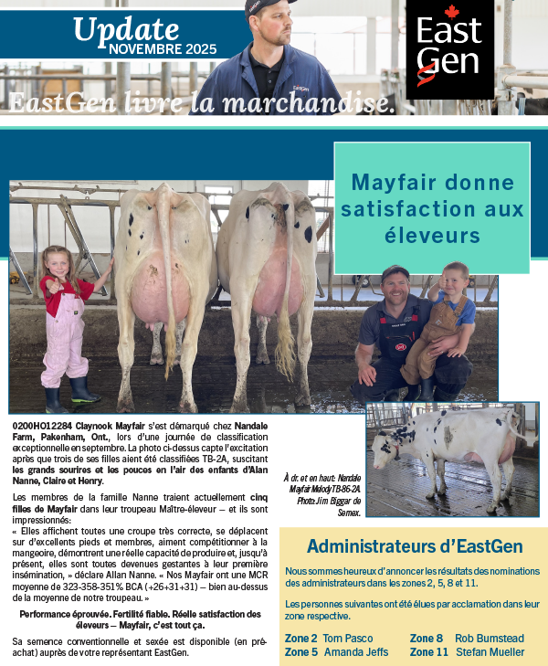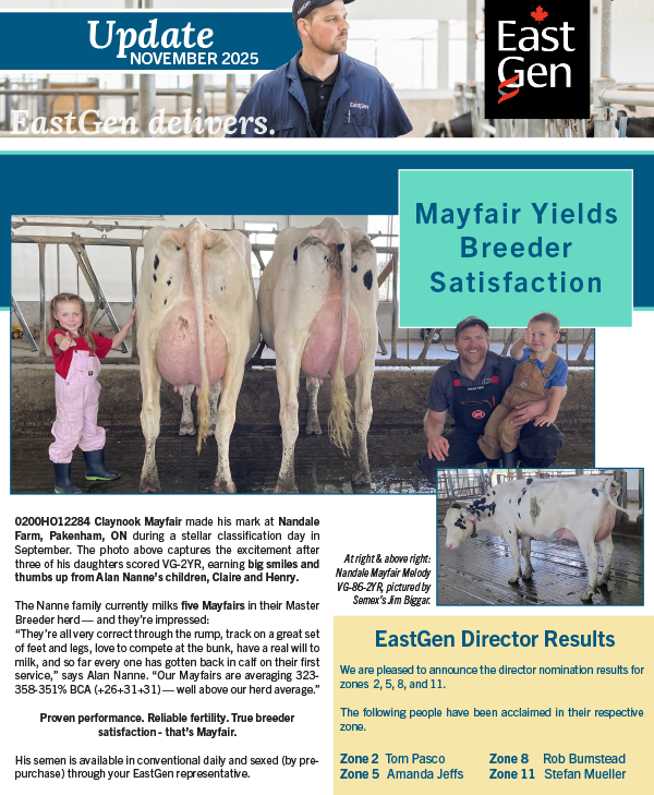 EastGen offers a complete line-up of dairy, beef and goat genetics as well as advanced reproductive solutions to farms in Ontario, New Brunswick, PEI and Newfoundland & Labrador. At EastGen, we challenge ourselves to constantly advance the dairy industry and we are accountable to farmers first. EastGen has the best-trained, most knowledgeable staff in dairy genetics. We lead the dairy industry with unmatched genetic innovation, leading-edge technology and advanced reproductive solutions. Partnering with EastGen gives you the products and programs to meet or exceed your specific genetic goals.